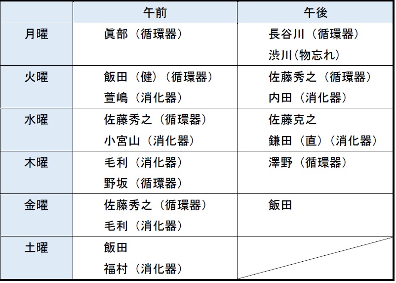 ご希望の科をクリックしてください、担当医表が開きます。 内科担当医表 外科担当医表 外科診療は一般的な外傷の診療を行います。ヘルニアや肛門等の専門的な診療は対応が出来かねますので、外科受診を希望される患者様で、診療の可不可がご不明な場合はお手数ですがお電話にて確認をお願いいたします。」 整形外科担当医表 第3、5土曜日は予約制になっております 脳神経外科担当医表 もの忘れ外来を行っております(予約制) 横浜市もの忘れ健診を行っております(予約制) 糖尿外来担当医表 予約制のため事前にお問い合わせください教育入院は常勤医不在のため出来ません