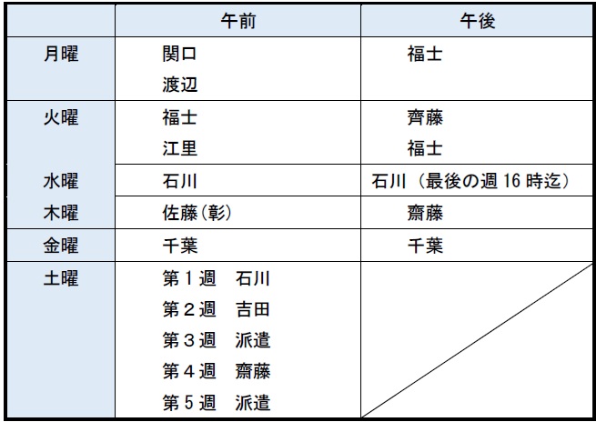 ご希望の科をクリックしてください、担当医表が開きます。 内科担当医表 外科担当医表 外科診療は一般的な外傷の診療を行います。ヘルニアや肛門等の専門的な診療は対応が出来かねますので、外科受診を希望される患者様で、診療の可不可がご不明な場合はお手数ですがお電話にて確認をお願いいたします。」 整形外科担当医表 第3、5土曜日は予約制になっております 脳神経外科担当医表 もの忘れ外来を行っております(予約制) 横浜市もの忘れ健診を行っております(予約制) 糖尿外来担当医表 予約制のため事前にお問い合わせください教育入院は常勤医不在のため出来ません