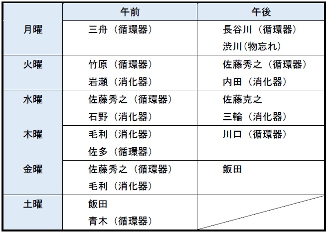 ご希望の科をクリックしてください、担当医表が開きます。 内科担当医表 外科担当医表 外科診療は一般的な外傷の診療を行います。ヘルニアや肛門等の専門的な診療は対応が出来かねますので、外科受診を希望される患者様で、診療の可不可がご不明な場合はお手数ですがお電話にて確認をお願いいたします。」 整形外科担当医表 第3、5土曜日は予約制になっております 脳神経外科担当医表 もの忘れ外来を行っております(予約制) 横浜市もの忘れ健診を行っております(予約制) 糖尿外来担当医表 予約制のため事前にお問い合わせください教育入院は常勤医不在のため出来ません
